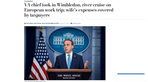 This latest witch hunt for dissenters comes in the wake of a scathing inspector general's report last month on Shulkin's 10-day junket to Europe last summer. [‘VA Secretary and Delegation Travel to Europe, PDF] The VA secretary spent a grand total of three and a half days on supposed business meetings in Copenhagen and London. For the rest of the time, Shulkin directed a VA underling to act as his personal travel agent—on your dime—to plan sightseeing for him and his wife, including: