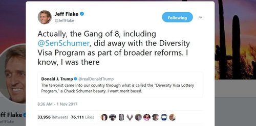 Seven weeks ago, Sen. Jeff Flake smugly tweeted to President Trump that the DV lottery program would have been killed if only the Gang of Eight illegal alien amnesty had been signed into law. In D.C., you see, stupid government programs will only die if hitched to even bigger, more reckless legislative abominations.