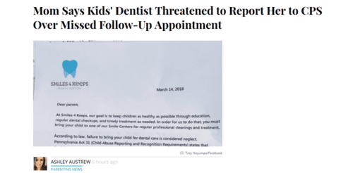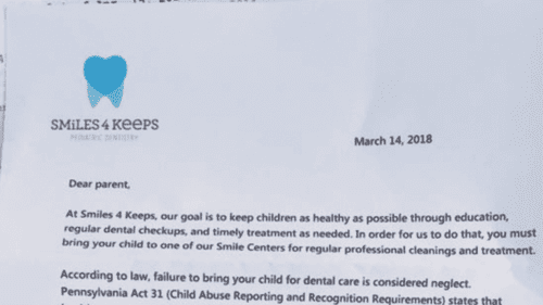 Mom Trey Hoyumpa shared a letter last week on Facebook from a dental office called Smiles 4 Keeps in Bartonsville, Pennsylvania. It informed her that if she did not make a dental appointment for "regular professional cleanings" for her child, she could be charged with "dental neglect." Citing a law called Pennsylvania Act 31 on child abuse recognition and reporting, the dental office threatened to report the mom to state authorities if she did not schedule an appointment.