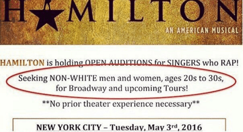 Gregory Hood in his scathing review [‘Hamilton’ as the Ultimate Expression of the System, American Renaissance, April 25, 2016] told us that Hamilton’s audience is "overwhelmingly white." This raises all sorts of awkward questions that Goodwhites seem not capable of asking. For example: Isn't Hamilton just a Minstrel Show? Doesn't the phrase "cultural appropriation" apply? Would a show about the Civil Rights movement with an all-white cast—Johnny Depp playing Martin Luther King, perhaps—be acceptable?
