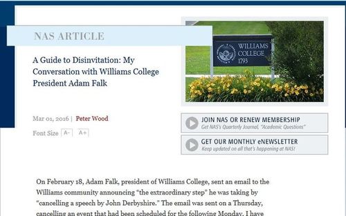 [A Guide to Disinvitation: My Conversation with Williams College President Adam Falk by Peter Wood; nas.org, March 1, 2016.]