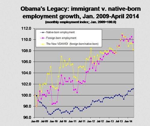 Of course, over the entire Obama era—January 2009 to April 2014—the displacement of native-born American workers by immigrants is painfully evident in the NVDAWDI graphic: