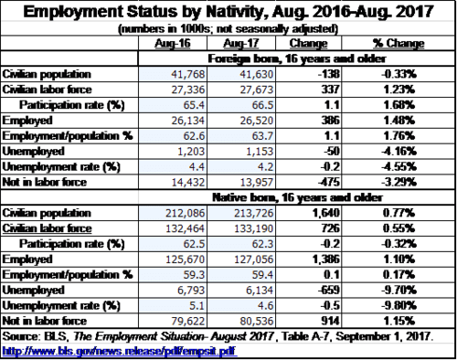 During Trump’s first seven months immigrant employment rose by 510,000, an 1.11% increase, while native-born Americans gained 1,145,000 jobs, a 1.96% increase.