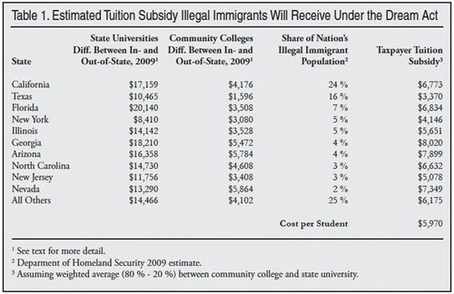 These bills would have required states to charge in-state tuition for young illegal alien students. In effect, each would have received a tuition subsidy averaging some $6,000 per year.[Estimating the Impact of the DREAM Act, By Steven A. Camarota, CIS.org, November 2010]