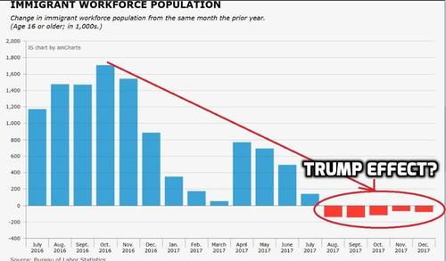 According to the Labor Department employment report released last Friday, December there were 77,000 fewer working-age immigrants (legal and illegal) in the country in December 2017 than in December 2016—a decline of 0.18%. This follows year-over-year drops of 138,000 in August, 143,000 in September, and 117,000 in October, and 64,000 in November.