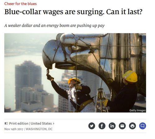 “It is commonly said that wage stagnation contributed to an economic anxiety in middle America that carried Donald Trump into the White House…Yet Mr. Trump’s rise seems to have coincided with a turnaround in fortunes for the middle class. … The latest development—one that will be of particular interest to Mr. Trump—is that blue-collar wages have begun to rocket. …In the year [2017] to the third quarter, wage and salary growth for the likes of factory workers, builders and drivers easily outstripped that for professionals and managers. In some cases, blue-collar pay growth now exceeds 4%…” Blue-collar wages are surging. Can it last?, The Economist, Magazine, November 14th 2017