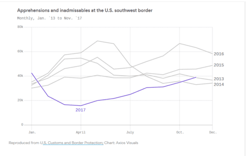 This helps explain why a reduction in the immigrant workforce population reduction is compatible with reports of a recent increase in illegal immigration on the U.S. southwest border (albeit still less than at the end of the Obama Regime).