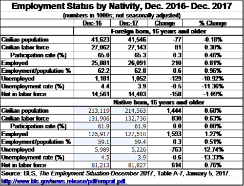 Note that this is a net figure. The year-over- year reduction in the immigrant working-age population does not mean new immigrants have stopped coming in. About 300,000 immigrants die annually, and an equal number leave (voluntarily or otherwise), according to a study by the Center for Immigration Studies. [U.S. Immigrant Population Hit Record 43.7 Million in 2016, By Steven A. Camarota and Karen Zeigler,October 16, 2017] So the 77,000 reduction in working-age immigrants from December 2016 to December 2017 is consistent with a gross inflow of about 500,000 new foreign-born workers (legal and illegal) over that period—the gross inflow more than offset by the gross reduction of 600,000 due to deaths, deportations, and immigrant emigrants.
