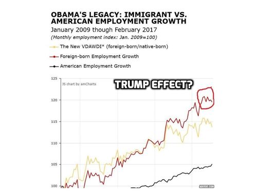 By contrast, the immigrant share of employment in Trump’s first month (16.95%) was 0.1% points below the share in Obama’s last month. This implies that Trump’s immigration policies may have already put 152,500 native-born workers back to work.