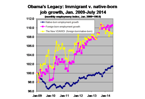 Native-born Americans employment growth is the blue line, immigrant employment growth is in pink, and NVDAWDI—the ratio of immigrant to native-born American job growth—is in yellow. The graphic starts at 100.0 for both native-born Americans and immigrant employment in January 2009, and tracks their growth since then.