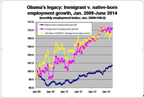 Native-born American employment growth is the blue line, immigrant employment growth is in pink, and NVAWDI—the ratio of immigrant to native-born American job growth—is in yellow. The graphic starts at 100.0 for both native-born and immigrant employment in January 2009, and tracks their growth since then.
