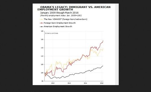March’s immigrant employment share was a full 2.105 percentage points above the level recorded at the start of Mr. Obama’s administration. With total employment now at 151.3 million, each percentage point translates to 1.51 million workers. Implication: Obama-era immigration may have pushed as many as 3.18 million (1.51 million times 2.105) native-born Americans onto the unemployment rolls.
