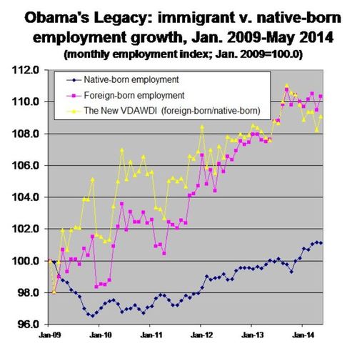 The displacement of native-born American workers by immigrants has been a central fact of economic life during most of the Obama era. This is evident in our New VDARE.com American Worker Displacement Index (NVDAWDI) graphic: