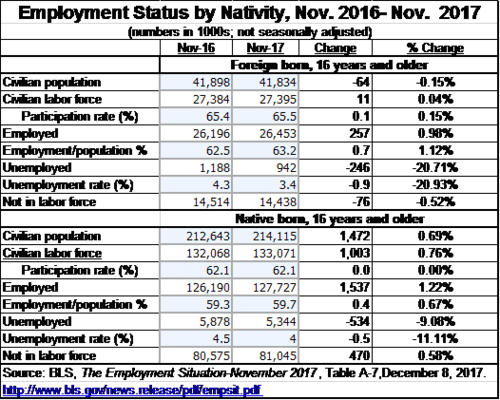 The November results—a decline (year over year) in the foreign-born working age population coupled with an apparently paradoxical increase (month over month) in native-born workers losing jobs to immigrants, is exactly what we anticipated would occur in the near future. Among the reasons: immigrant labor force participation rates are rising faster than those of native-born Americans, perhaps because immigrants are more mobile than native-born Americans and can move to new jobs.