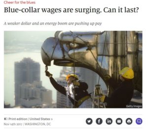 It is commonly said that wage stagnation contributed to an economic anxiety in middle America that carried Donald Trump into the White House…Yet Mr. Trump’s rise seems to have coincided with a turnaround in fortunes for the middle class. … The latest development—one that will be of particular interest to Mr. Trump—is that blue-collar wages have begun to rocket. In the year [2017] to the third quarter, wage and salary growth for the likes of factory workers, builders and drivers easily outstripped that for professionals and managers. In some cases, blue-collar pay growth now exceeds 4%...” Blue-collar wages are surging. Can it last?, The Economist, Magazine, November 14th 2017