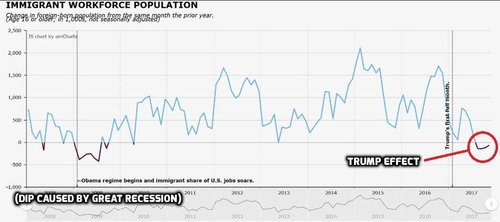 The Trump Effect lives! For the fourth consecutive month the immigrant working-age population (legal and illegal) declined from the same month of the prior year. This is a dramatic change from the last months of the Obama Regime, when year-over-year immigrant working-age population increases ran far in excess of the estimated 1 million legal immigrants admitted annually, suggesting that an unreported illegal alien surge was underway. And, finally, there are signs that this labor market tightening is boosting blue collar wages.
