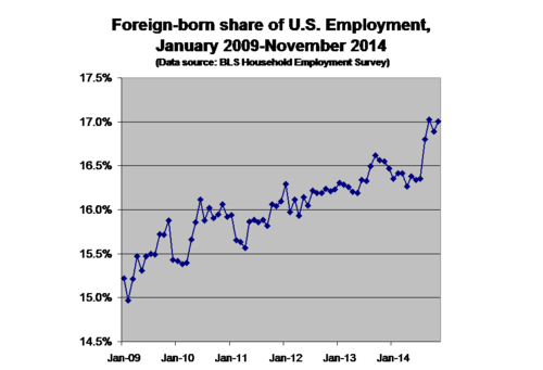 With total employment running at about 147 million, every one percentage point gain in employment share translates to 1.47 million more workers. From February 2009 to November 2014 the immigrant share of total employment rose from 14.97% to 17.00%—a gain of 2.03 percentage points.