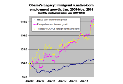 Native-born American employment growth is the black line, immigrant employment growth is in pink, and NVAWDI—the ratio of immigrant to native-born American job growth—is in yellow. The index starts at 100.0 for both immigrants and native-born Americans in January 2009, and tracks their employment growth since then.
