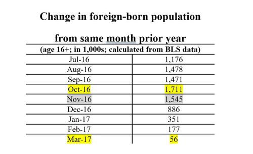 But by March 2017, the year-over-year increase had collapsed to just 56,000, far below the estimated legal influx, suggesting that the mere appearance of Trump has triggered a truly massive exodus of illegals (and/or is deterring legal immigrants).
