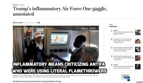 "[Sen. Tim Scott (R-S.C.) and I] had a great talk yesterday. I think especially in light of the advent of Antifa, if you look at what’s going on there. You have some pretty bad dudes on the other side also, and essentially that’s what I said. Now because of what’s happened since then with Antifa, when you look at really what’s happened since Charlottesville, a lot of people are saying, and people have actually written, 'Gee, Trump may have a point.' I said there’s some very bad people on the other side also. But we had a great conversation.Of course, Trump is completely right about Charlottesville Narrative Collapse. Blaming the Alt Right demonstrators, who were deprived of their civil rights by Democrat-controlled police and forced into the hands of the notoriously violent Communist AntiFa, is the greatest Main Stream Media manipulation since normie Americans were induced to believe that Iraq’s Saddam Hussein was responsible for 9/11.Trump’s inflammatory Air Force One gaggle, annotated, September 14 2017. Links added.