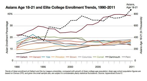 The centerpiece of Ron's essay: a killer graph comparing the steady rise from 1990 to 2011 of the Asian-American college-age population with the dead-flat proportions of Asian-American admittances to Ivy League schools, held down firmly in a tight band between thirteen and eighteen percent.