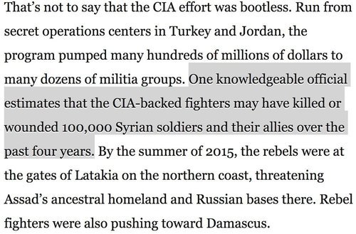 Given that Syria's prewar population was not 10 percent of ours, this is the equivalent of a million dead and wounded Americans. What justifies America's participation in this slaughter?