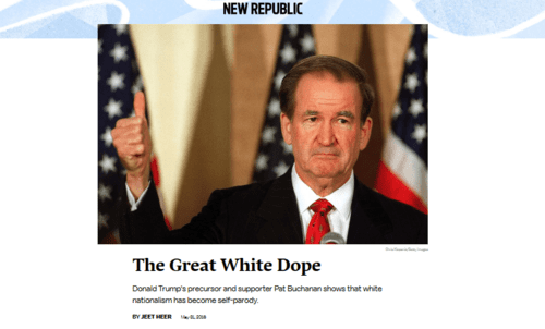 Jeet Heer’s New Republic hit piece The Great White Dope , triggered by Pat Buchanan’s excellent column, The Great White Hope, got one fact right: Buchanan was the forerunner to Donald Trump and thus has “special authority” to opine on him. [New Republic, May 31, 2016] Yet almost everything else Heer writes is hopelessly wrong—and reveals his own anti-white animus. You could almost say, to make another boxing analogy currently much in the news, that Buchanan Rope-A-Doped Heer.