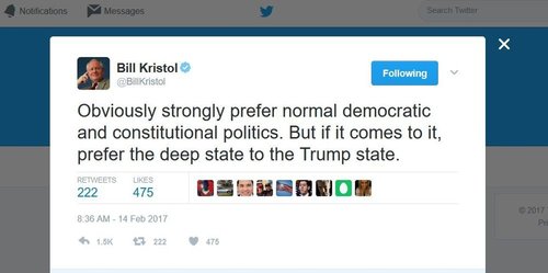 When Gen. Michael Flynn was forced to resign as national security adviser, Bill Kristol purred his satisfaction, "If it comes to it, prefer the Deep State to the Trump state."