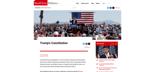 “Trump defends the fundamental principle that legitimate government proceeds only by the consent of the governed. The people remain sovereign.”And while Larry Arnn, now president of Hillsdale, has not endorsed Trump, he recently vehemently denounced the #NeverTrump movement on Hugh Hewitt’s March 10th podcast, saying “I can’t find any evidence since 2000 that Donald Trump is not a supporter of limited and Constitutional government.” [Transcript]Trump's Constitution, By Ken Masugi, March 22, 2016