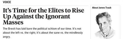 As Nigel Farage might say, no one is laughing now. And the global elite are now openly aligning against you and your supporters [It’s Time for the Elites to Rise Up Against the Ignorant Masses, by James Traub, Foreign Policy, June 28, 2016].