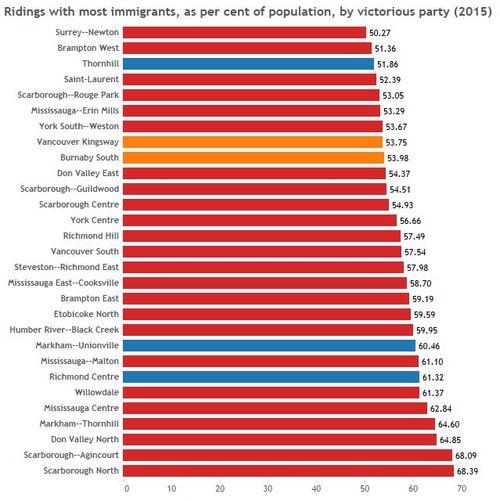 But unfortunately for Harper, the Liberals did not run a dud leader this time. Worse still, the Elections Canada demographic data demonstrates that, short of a radical change in immigration policy and/or galvanizing the white (= Canadian) electorate, it is the Conservatives that are living on borrowed time. [Have Canada's changing demographics made it time to retire the concept of ‘visible minority’?, By Douglas Quan, National Post, June 27, 2014] As it turns out, the Liberals no longer need to sweep Quebec to win (they won a bare majority 40 of 78 seats in 2015, many of them vizmin in Montreal). They can make up the numbers by winning those ridings that have passed the immigrant tipping point (ITP).