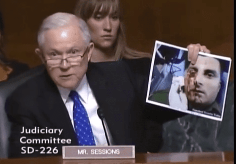 Above, Senator Jeff Sessions holds up a picture of a Border Patrol agent injured by a thrown rock.