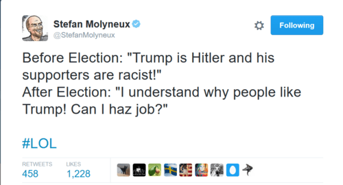 Your protests are not protests. They are vainglorious temper tantrums because you did not get your way. For the past eight years you have shown zero humility when you got your way. You insisted on rubbing our noses in it and demanded adherence to your agenda....I cannot thank you enough for helping me and so many others who did not like Trump suddenly appreciate him.[I Would Like to Thank the American Left, The Resurgent, November 11, 2016]