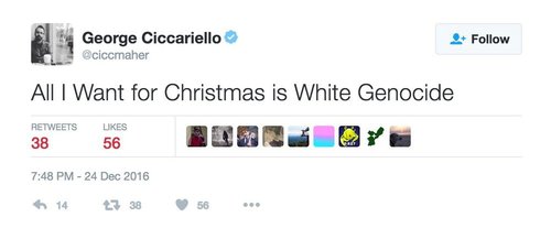 Similarly, George Ciccariello-Maher, a professor at Drexel University, tweeted "All I Want for Christmas is White Genocide." Lest there was any doubt what he meant, he added