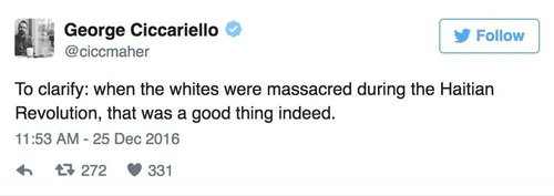 To clarify: when the whites were massacred during the Haitian revolution, that was a good thing indeed.