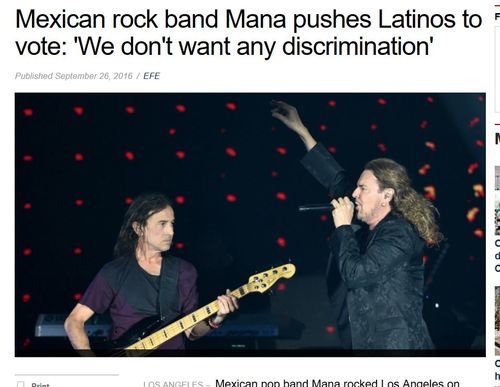 Mexican pop band Mana rocked Los Angeles on Sunday night at a concert at The Forum arena that combined its greatest hits with a political message encouraging Hispanics to vote in the upcoming United States presidential elections. "We don't want racism, we don't want violence, we don't want any discrimination," shouted Mana vocalist Fher Olvera during the Los Angeles concert, part of its "The Latin Power Tour." "This country is multicultural, made by immigrants. And whether this bastard [thought to be a reference to D. Trump] likes it or not, we are already more than 50 million Latinos," said Olvera, alluding to Republican presidential nominee Donald Trump without naming him explicitly.[Mexican rock band Mana pushes Latinos to vote: 'We don't want any discrimination', September 26, 2016]