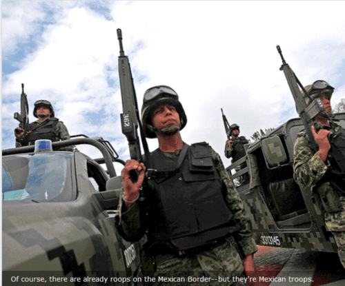 The full Senate of the [Mexican] Republic unanimously passed a resolution calling on the [Mexican] federal government to suspend bilateral cooperation with the United States in the areas of migration and the fight against transnational crime "as long as President Donald Trump does not show respect to the people of Mexico."So who decides when Trump is showing respect to the Mexican people? The Mexican Senate, apparently. And the Mexican Senate doesn’t like, guess what, “militarizing” the border.[Senado pide suspender cooperación migratoria y anticrimen con EU , “Senate calls to suspend migratory and anti-crime cooperation with the U.S.,” By Ivan E. Saldana, El Excelsior, April 4, 2018, emphasis added.]