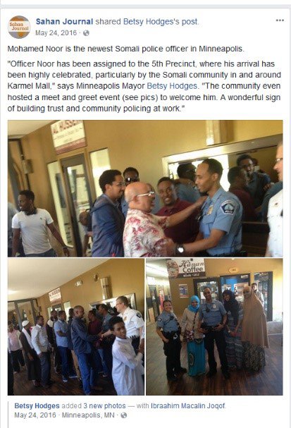 So, a few months later when the department hired Mohamed Noor in March 2015, it was a big deal. The mayor herself, Betsy Hodges, issued a public statement boasting about the hire on Facebook [May 24, 2016]
