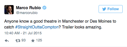 Youth vote-pandering GOP Florida Sen. Marco Rubio jumped on the cultural bandwagon, too, with two obsequious messages on Twitter featuring the hashtag "#straightouttacompton." It's a publicity coup for rappers-turned-multimedia moguls Dr. Dre (Andre Young) and Ice Cube (O'Shea Jackson) as they pimp the movie—named after their breakthrough 1988 album—glorifying the rise of their band N.W.A. (Niggaz Wit Attitudes) and the hardcore gangsta rap genre.