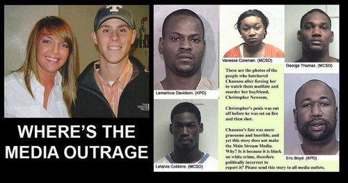 The Main Stream Media is working very hard right now to send down the Memory Hole the abduction and days-long torture of an 18-year-old disabled white man by four blacks (right)including one he pathetically thought was his friend, who (incredibly) livestreamed the atrocity on Facebook. Not coincidentally, there seems to be no national media coverage of this weekend’s tenth anniversary of an earlier stellar moment in American race relations and MSM malfeasance: what I have called “The Knoxville Horror,” the kidnap-gangrape-torture-murders in Knoxville TN, by yet another black gang, of white sweethearts Channon Christian, 21, and Christopher Newsom, 23