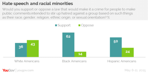 Brimelow: Because people think differently and act differently. There’s a fine example from YouGov at the moment, a poll about peoples’ attitudes to freedom of speech. What it shows is that African American and Hispanics are much more inclined to want government restrictions on what people can say than whites are. It’s a systematic and enormous difference. And that concerns me, in terms of what’s going to happen when blacks and Hispanics form a majority.