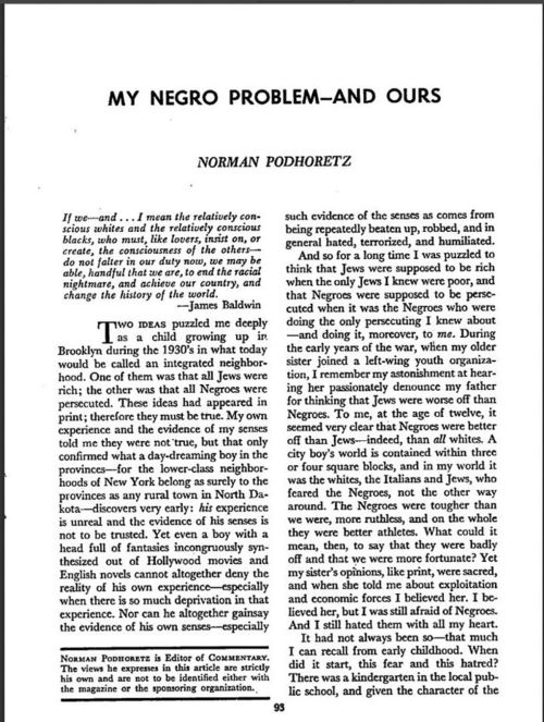 When Norman Podhoretz wrote My Negro Problem—And Ours [PDF] in 1963, he may have been wrongheaded in places, but he was wrong headed in an extremely frank and intelligent way. He was attacked by black kids in school in the 1940s, and wrote