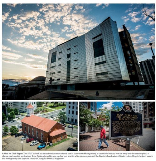 The Politico article is illustrated by a sort of group photograph of the SPLC headquarters (the famous “Poverty Palace”) and two other historic sites in Montgomery, AL (see right). Caption: