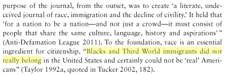 To the foundation, [JF: i.e. the American Renaissance magazine] race is an essential ingredient for citizenship. “Blacks and Third World immigrants did not really belong in the United States and certainly could not be ‘real’ Americans.”