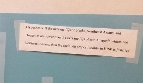 The project that started the controversy was titled “Race and IQ.” It raised the hypothesis: “If the average IQs of blacks, Southeast Asians, and Hispanics are lower than the average IQs of non-Hispanic whites and Northeast Asians, then the racial disproportionality in (HISP) is justified.”[High school science fair project questioning African American intelligence sparks outrage, by Diana Lambert and Anita Chabria, The Sacramento Bee, February 10, 2018]