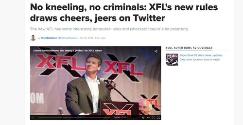 “I think, again, it’s a time-honored tradition to stand and appreciate the national anthem with any sport,” McMahon said during a press conference introducing the league. “Here in America–for that matter, in any country…so I think it’d be appropriate to do that.”And, in another sharp break from NFL practice, McMahon also said that players would not be allowed to compete if they have criminal records. [No kneeling, no criminals: XFL's new rules draws cheers, jeers on Twitter, by Pete Blackburn, CBSsports.com, January 25, 2018][XFL players should stand for national anthem, Vince McMahon says, by Thomas Barrabi, Fox Business, January 25, 2018]