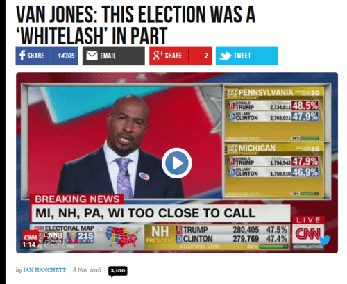 Now, Jones—who most recently race-baited Donald Trump supporters by blaming them for a "whitelash"—has reinvented himself as a roving correspondent traveling the nation to analyze the election results and to lecture others to "be passionate. But be compassionate, too" with fellow citizens who hold different political viewpoints.