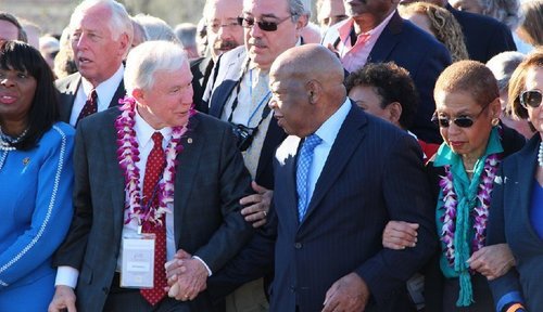 Note that Sessions had groveled in 2015 by going to the 50th anniversary celebration of the march across the bridge —photographed walking arm and arm with Lewis himself! Sessions even issued a press release celebrating he marchers’ achievements and spearheaded the campaign for them to be awarded the Congressional Gold Medal. [Sessions Helps Spearhead Congressional Gold Medal For Selma Marchers, Sessions.Senate.Gov, , March 6, 2015]