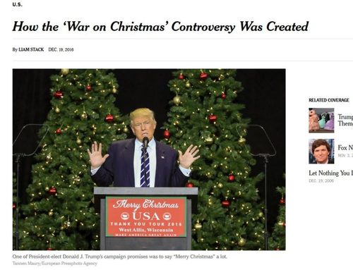 Stack, though, went on to baldly declare that “There is no evidence of an organized attack on Christmas in the United States,” and he attributed any concern over this supposedly non-existent attack entirely to FOX News.[How the ‘War on Christmas’ Controversy Was Created, By Liam Stack, December 19, 2016]]