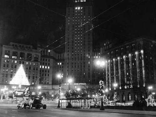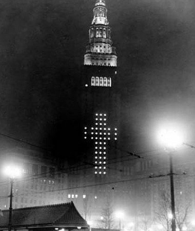 Above, Cleveland’s Terminal Tower, 1938, displaying lights in the shape of a cross for Christmastime.